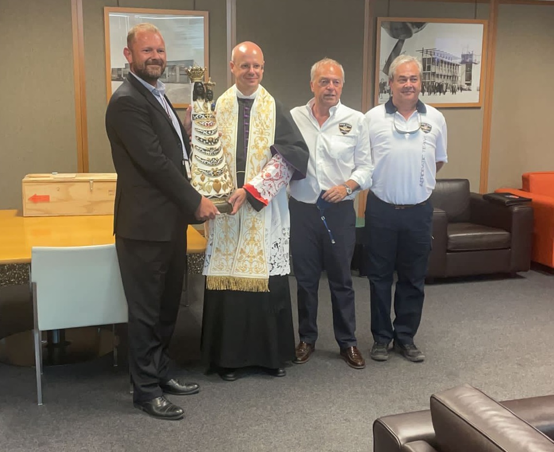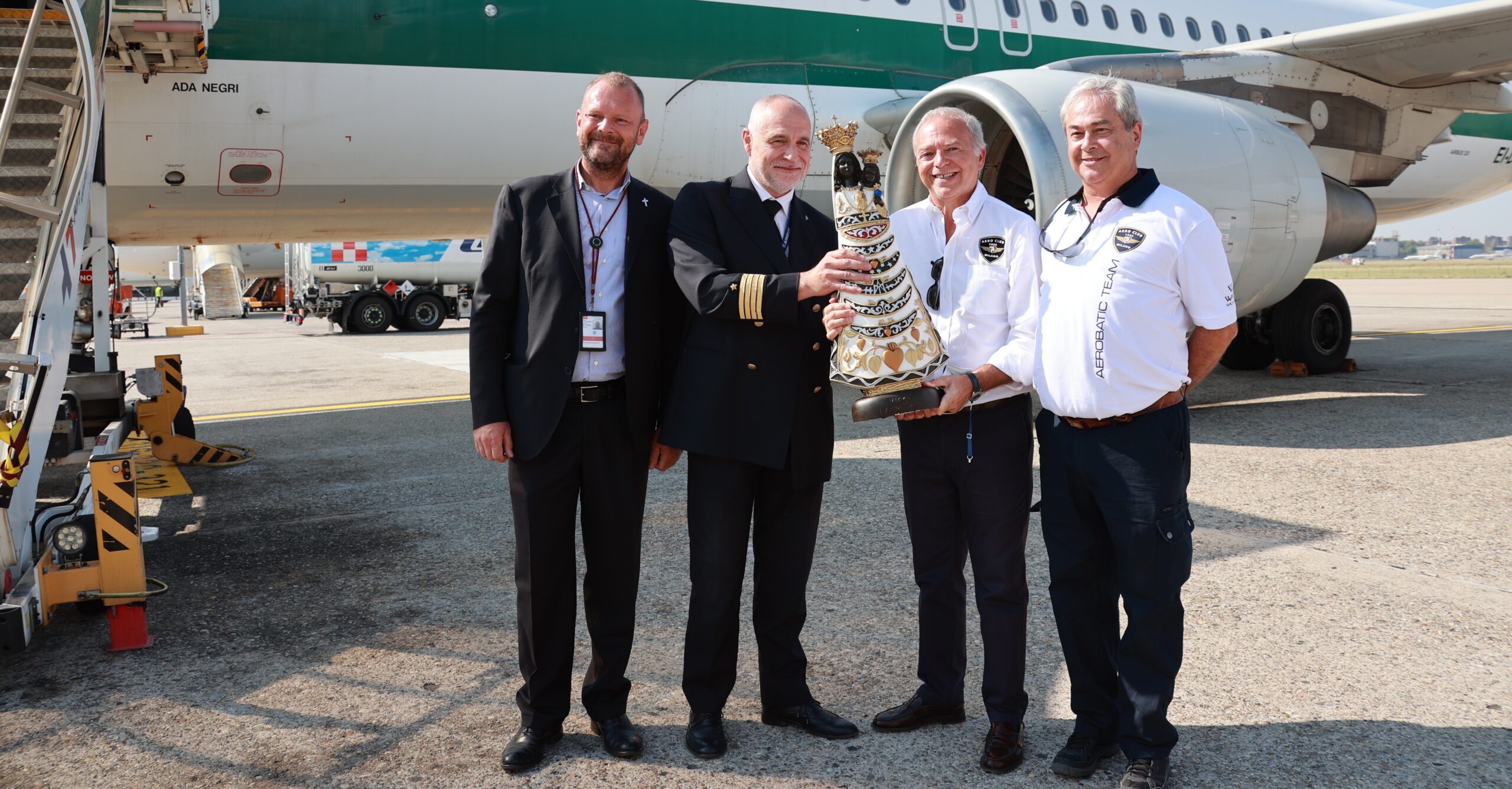 Al termine dei saluti di rito al Comandante Enrico Ferrari ed all’equipaggio del volo Alitalia la statua è stata consegnata al Comandante Luca Salvadori ed al suo copilota Giambattista Bianchi di AeroClub Milano che, insieme a don Fabrizio Martello, Cappellano dell’Aeroporto di Milano Linate e Coordinatore Nazionale Pastorale Aviazione Civile per la Conferenza Episcopale Italiana, l’hanno trasportata in volo a Malpensa.