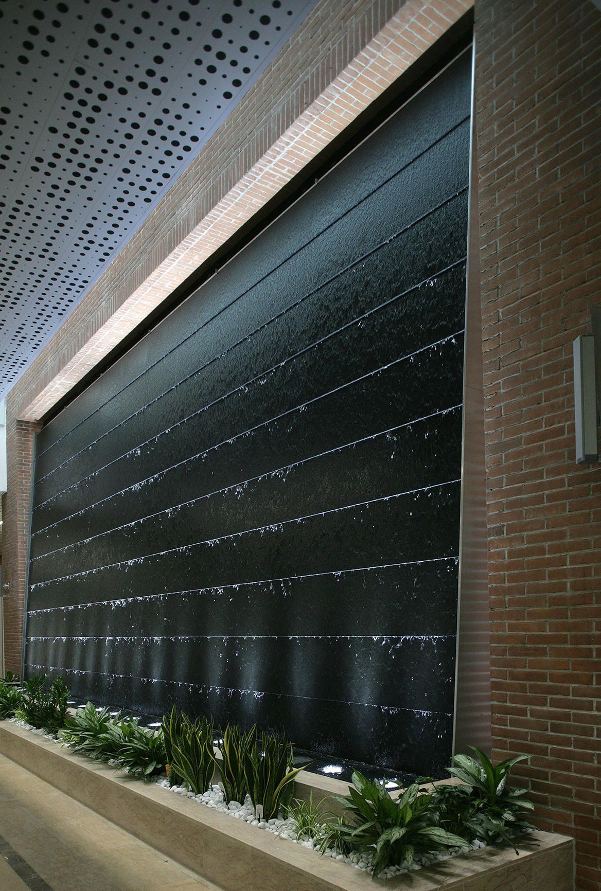 Al centro un grande waterwall, un muro d’acqua di marmo nero Zimbawe, riprodotto in proporzioni più ridotte anche in due differenti spazi al piano arrivi.