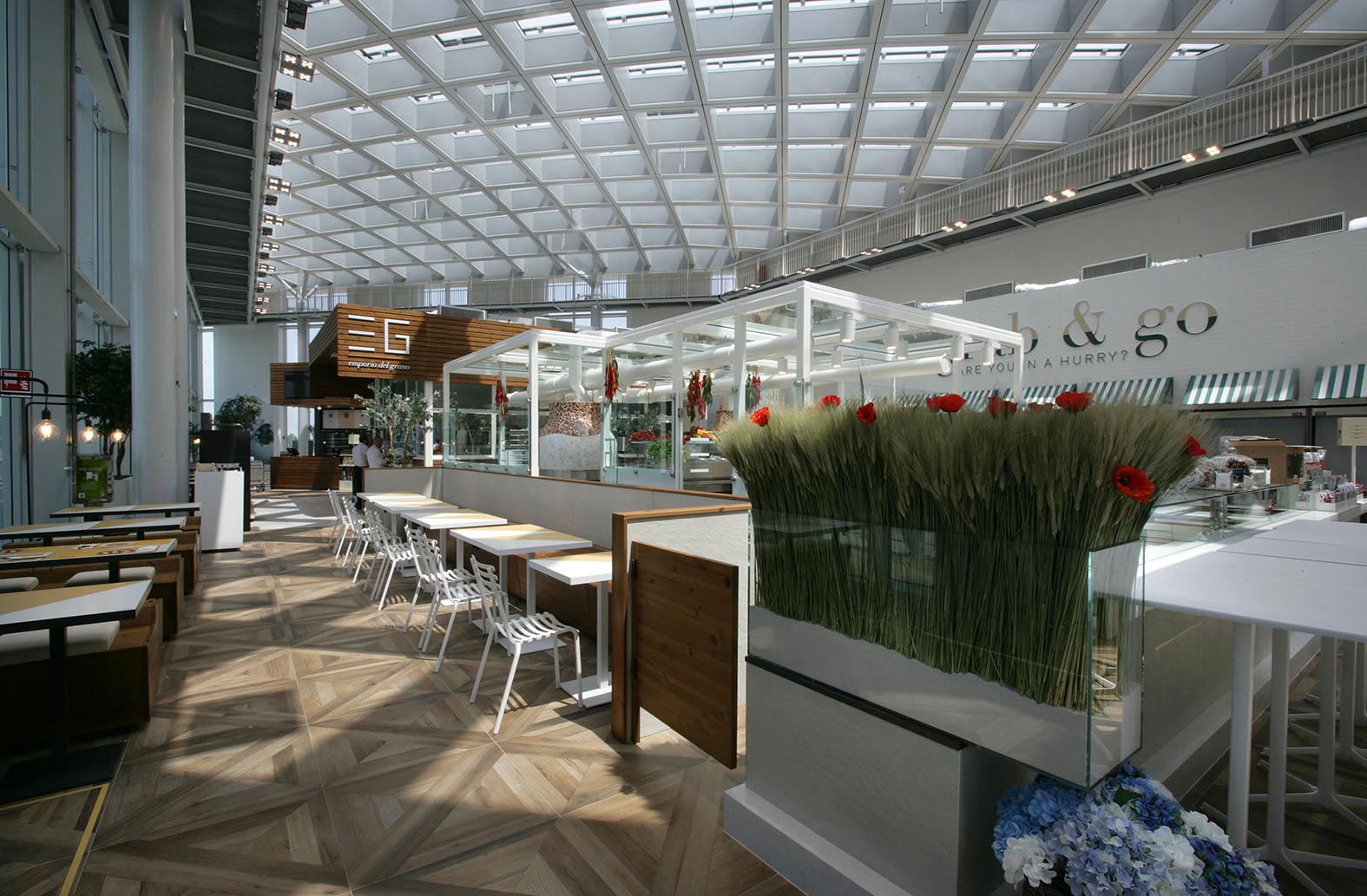 Il primo piano è caratterizzato da una grande galleria vetrata destinata ad accogliere i passeggeri con funzione di atrio commerciale e zona di orientamento prima dell’ingresso nell’area dei check-in. La galleria ha una lunghezza massima di 278 metri, una larghezza di 18 metri ed un’altezza di 18 m dal piano campagna. I due lati della galleria, simili a delle “ali” vetrate, ospitano sale d’attesa e zone per il ristoro, con maggiori spazi e servizi per i passeggeri.