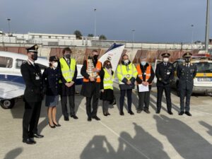 La statua è in viaggio tra gli scali italiani nell’ambito delle iniziative del Giubileo Lauretano per il centenario della proclamazione della Madonna di Loreto come patrona degli aviatori e dei viaggiatori.